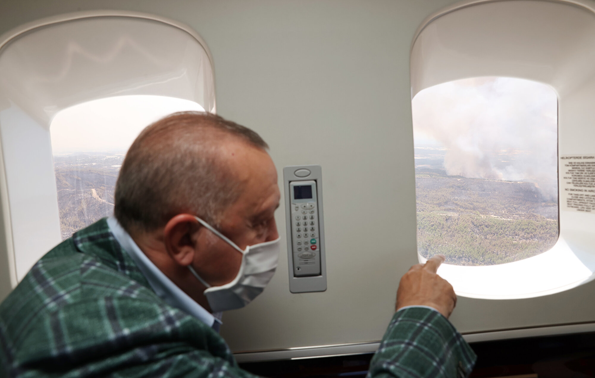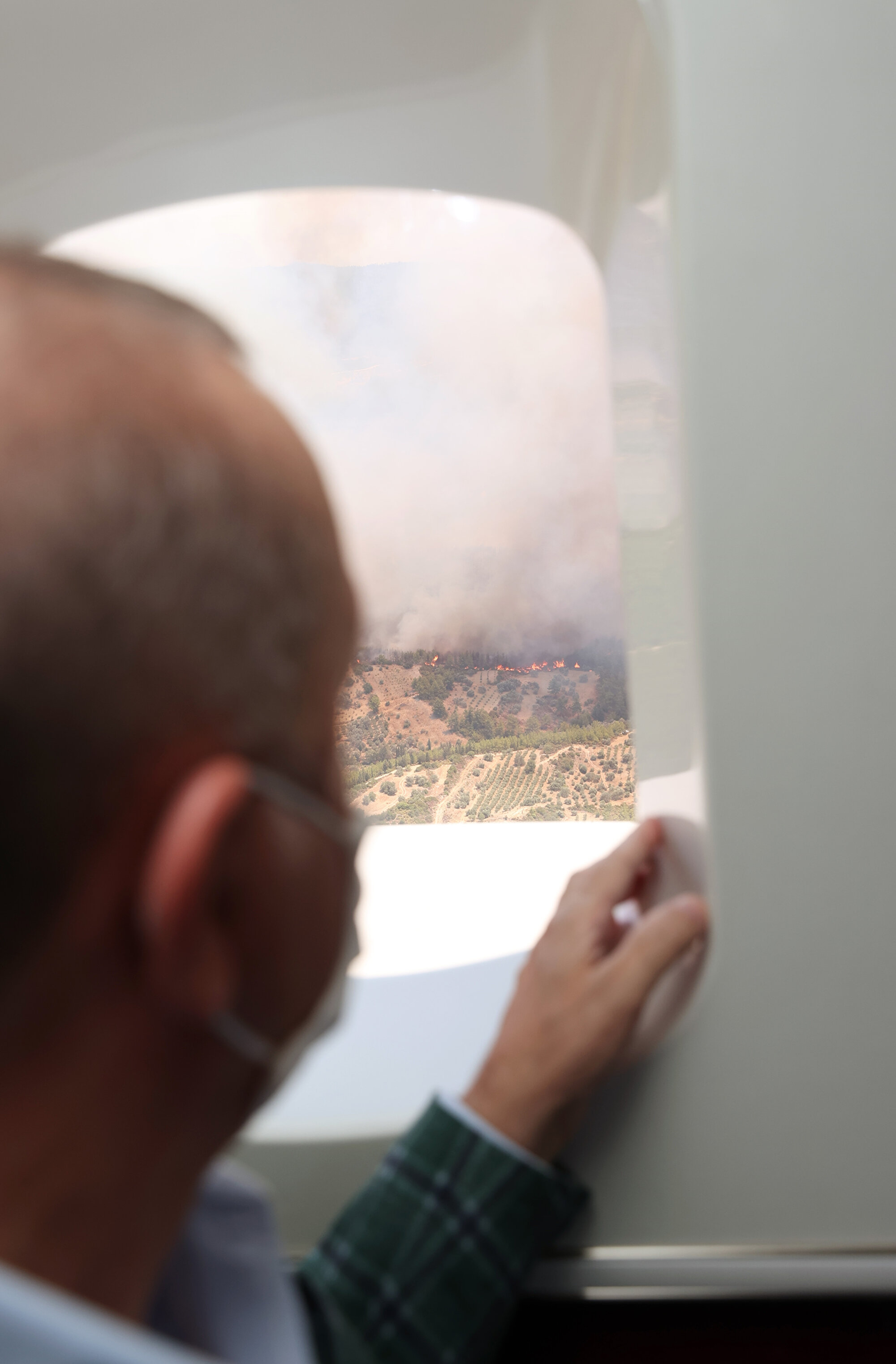 Cumhurbaşkanı Recep Tayyip Erdoğan, Antalya'nın Manavgat ilçesindeki orman yangınlarından etkilenen bölgelerde helikopterden incelemelerde bulundu.