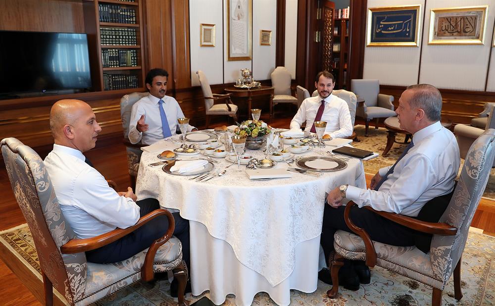 İki liderin yaklaşık 3,5 saat süren görüşmesine Hazine ve Maliye Bakanı Berat Albayrak ile Katar Maliye Bakanı Ali Serif el Emadi de katıldı.