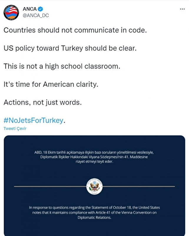Ülkeler kodlu iletişim kurmamalıdır. ABD'nin Türkiye'ye yönelik politikası net olmalıdır. Burası bir lise sınıfı değil. Amerikan netliğinin zamanı geldi. Eylemler, sadece kelimeler değil. Türkiye'ye jet yok.