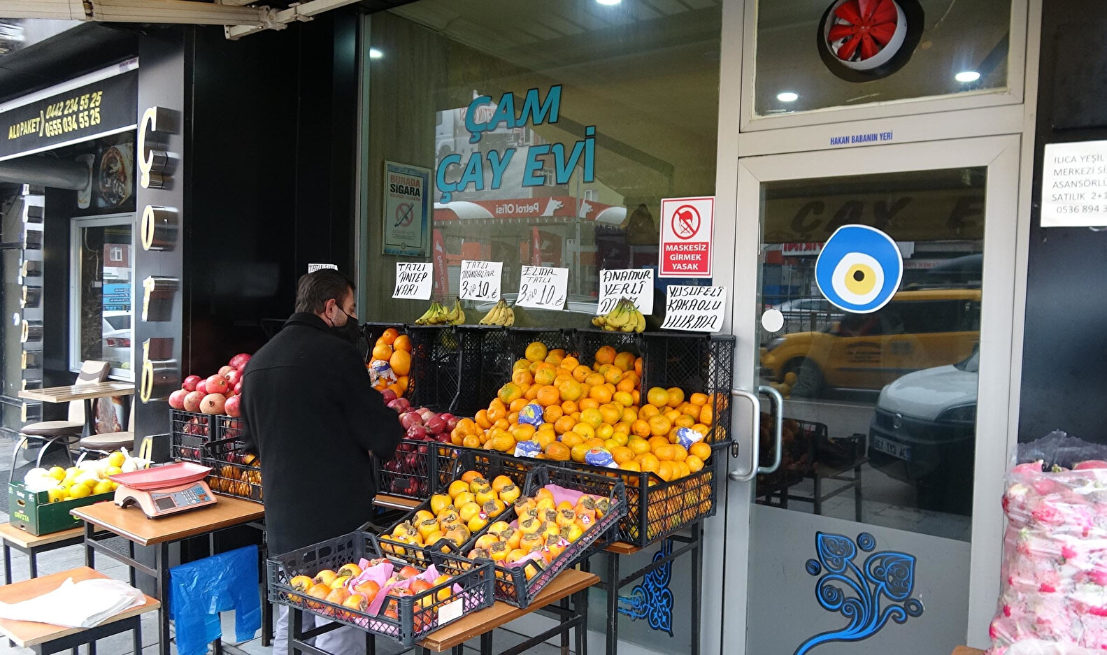 Sandalye ve masaları kaldırdığı iş yerine meyve dolu kasaları koyan Bozdemir, "Yıllardır kahvehane olarak işlettiğim iş yerimi manava çevirdim. Sandalyeleri kaldırarak içeriye meyve ve sebze kasalarını yığdım. Eşime dostuma dört beş tane meyve satabilirsem 'Allah bereket versin' derim. Para kazanmak için aklıma başka bir alternatif yol gelmedi" diye konuştu.