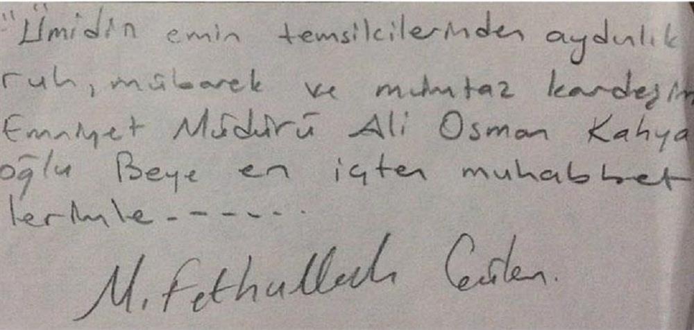 Notta, "Ümidin emin temsilcilerinden aydınlık ruh, mübarek ve mümtaz kardeşim Emniyet Müdürü Ali Osman Kahya oğlu beye en içten muhabbetlerimle... M. Fetullah Gülen." ifadelerinin yer aldığı belirtildi.