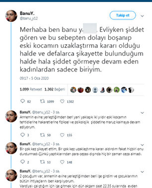 Twitter üzerinden, paylaşım yapan 2 çocuk annesi Banu Y., eski eşi Musa Ö. ile şiddet gördüğü için boşandığını belirtip, ayrılmalarının ardından geçen iki yılda şiddet ve tehdit olaylarının sürdüğünü aktardı.