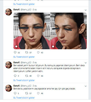 - "Ben, kız kardeşim veya annem öldürüldükten sonra 'eski eşi tarafından defalarca darp ve tehdit edildi, ardından öldürüldü' haberlerinin bir parçası olacağız. Belki de bu yazdıklarımı paylaşacaklar ama her şey için çok geç olacak.Ben adalet yerini bulsun istiyorum. Bu korkuyla yaşamak istemiyorum. Beni darbeden, ölümle tehdit eden insanın elini kolunu sallayarak dışarıda dolaşmasını istemiyorum. Lütfen yardım edin."