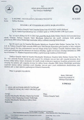 - Adalar Kaymakamlığı da önceki gün yaşanan hukuksuz baskın konusunda İBB’yi uyardı. Belediyeye gönderilen yazıda “Türkiye Gençlik Vakfı ile İstanbul Büyükşehir Belediyesi-İstanbul Şehir Hatları Turizm San. Ve Tic. A.Ş. arasına Borçlar Kanunu’na göre geçerli bir sözleşme mevcut iken adli yargıda konunun dava konusu edilip tahliye kararı alınmadan tek taraflı olarak kiralayanın taşınmazı boşaltma girişiminin yasal olmadığı, bu nedenle adli yargıdan alınmış bir tahliye kararı olmadan İBB Zabıta Müdürlüğü tarafından yapılmak istenen tahliye işleminin yasal olmadığı, mevcut gayri yasal müdahalenin durdurulması aksi takdirde adli ve idari işlemin yapılacağının bilinmesi…” ifadeleri kullanıldı.