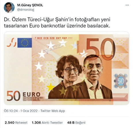 BioNTech’in kurucuları Özlem Türeci ve Uğur Şahin’in fotoğraflarının yeni tasarlanan euro banknotlarının üzerinde basılacağına dair bir iddia paylaşıldı. Twitter’da on binlerce beğeni olan bu iddia tweetlerinde bir de Türeci ve Şahin’in fotoğraflarının yer aldığı 50 euro görseli yer alıyor.