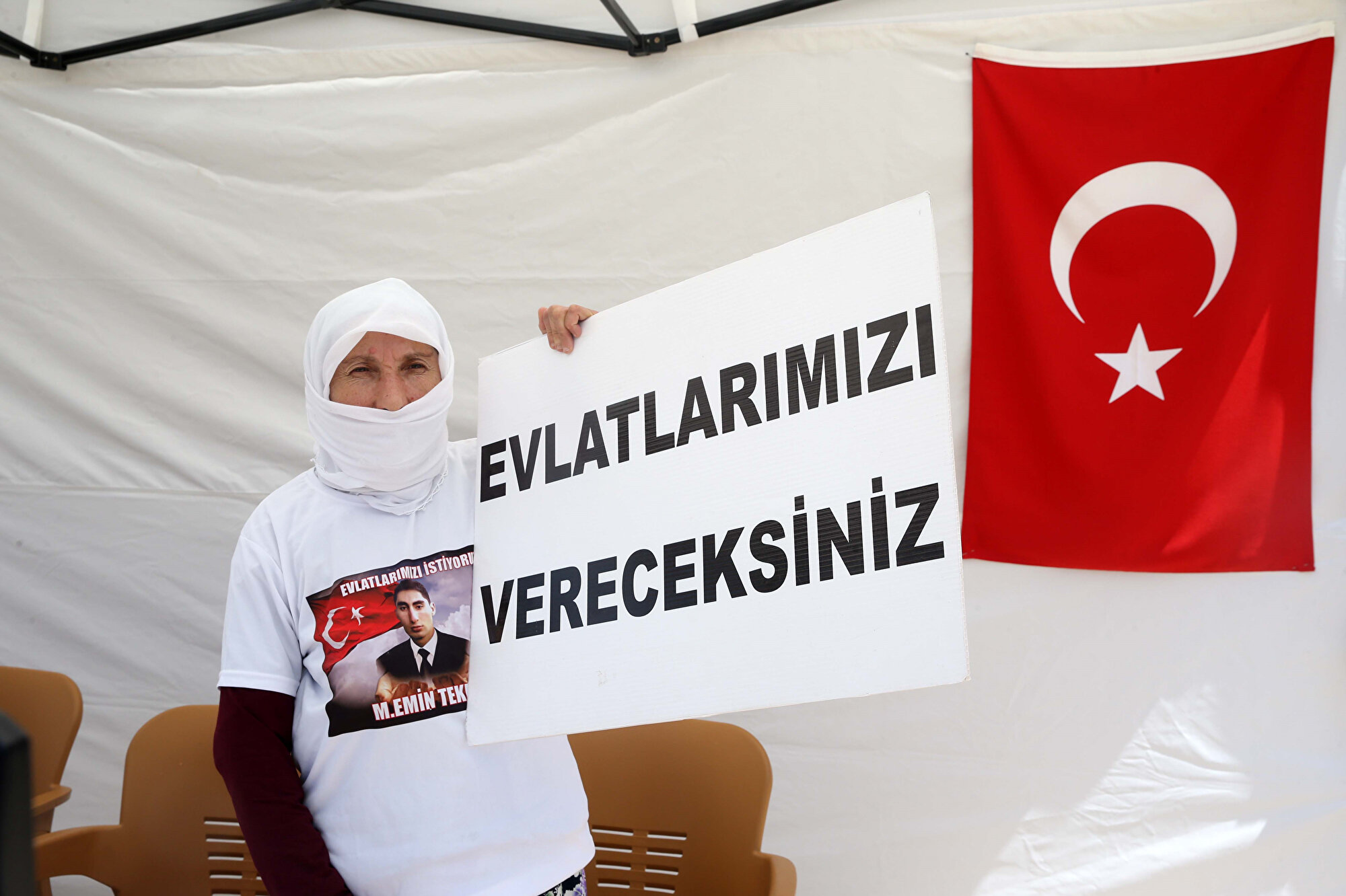 Terör örgütü tarafından 2014'te kaçırılan oğluna kavuşmak için HDP İl Başkanlığı önünde oturma eylemi yapan Gülbahar Teker, "Halk Düşmanı Parti", "Evlatlarımızı vereceksiniz", "Ha HDP, ha PKK", "Türk-Kürt kardeştir, HDP kalleştir" ve "Halkı Dolandıran Parti" yazılı pankartlar açtı.