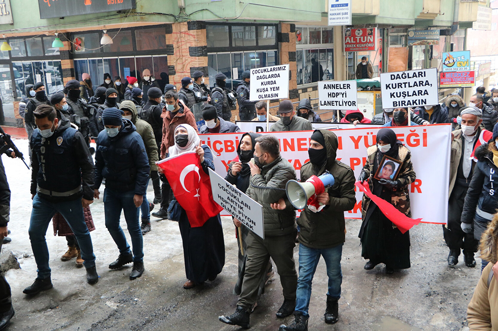 Bugün de Hakkari'de HDP il binası önünde bir araya gelen 12 ailenin üyeleri yine protestoda bulundu. Çocukları terör örgütü PKK tarafından kaçırılan aileler, ellerinde Türk bayrakları ve üzerinde 'Kürt çocukları artık HDP'ye piyon olmayacak', 'Çocuklarımız dağda kurda, kuşa yem olmasın' yazılı pankartlarla bir yürüyüş yaptı.