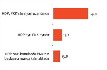 Vatandaşlar HDP ile PKK arasındaki ilişkiyi de değerlendirdi. Araştırmaya göre HDP’nin PKK’nın siyasi uzantısı olduğunu düşünenlerin oranı yüzde 69 olarak belirlendi. Yüzde 17,2’lik kısım ise ikisinin ayrı olduğunu düşündüğünü dile getirdi.
