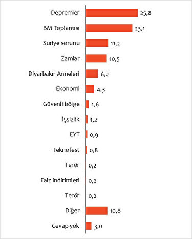 - “Eylül ayının en önemli gündem maddesi nedir” sorusunu da yanıtlayan katılımcılar İstanbul’da yaşanan 5,8 şiddetindeki depremi en önemli gündem konusu olarak gösterdi. İkinci BM toplantısı, üçüncü Suriye sorunu yer aldı.