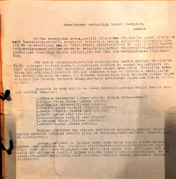 MİT’in "Fetullah Gülen" dosyasından çıkan bir belge FETÖ’nün CIA bağlantısı ve ilişkilerini ortaya koyuyor. Körfez Savaşı’nda istihbarat örgütleri Türkiye’de faaliyetlerini artırınca MİT takibi yoğunlaştırıyor. CIA üyelerini izleyen MİT, Fetullah Gülen ve örgütünün bu ajanlara yardım ettiğini belirledi. Bu bilgi ABD, Alman, Yunan, İngiliz, İtalyan ve Japon ajanların listesiyle birlikte Genelkurmay’a iletildi.