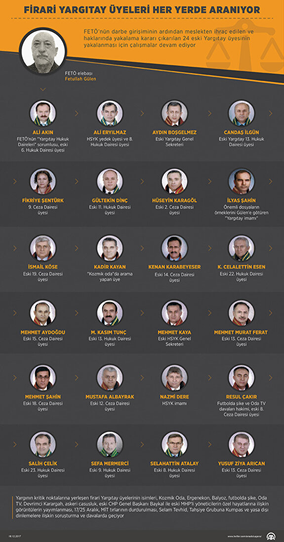 - FETÖ'nün darbe girişimi sonrası meslekten ihraç edilen ve tutuklanan Anayasa Mahkemesi, Yargıtay, Danıştay ile Hakimler ve Savcılar Yüksek Kurulu (HSYK) üyelerinin yargılanmasına devam edildi.