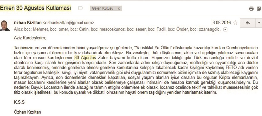 Mason locasına yeni üye kabulü için 6 Aralık 2016 tarihinde bir oylama yapıldığını söyleyen Kızıltan, bu oylamadan birkaç gün önce de yine bir mail atarak FETÖ tehlikesine vurgu yaptı. 9 yıldır ‘harici’ oylamasına katıldığını belirten Kızıltan, bugüne kadar oylaması yapılacak kişilerle ilgili hiçbir tahkikat yapmadığını ancak üyelik başvurusunda bulunan kişilerle ilgili siyah oy kullanacağını diğer masonlara bildirdi.