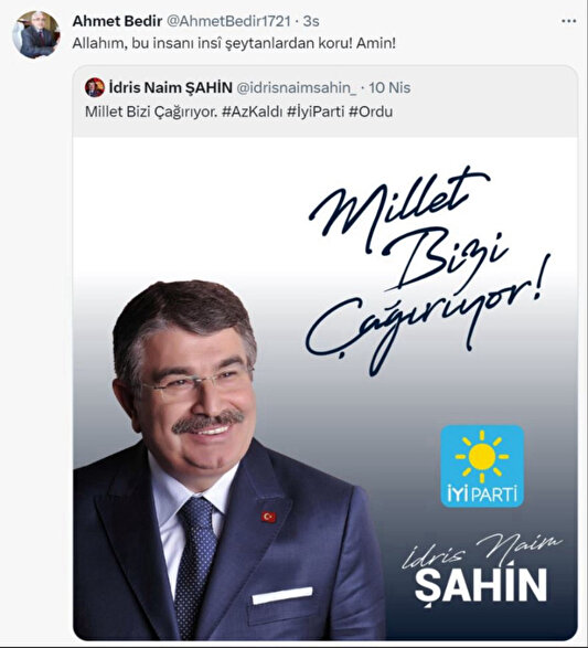 , İYİ Parti'den Ordu Milletvekili olan İdris Naim Şahin'in adaylığı sonrası bir paylaşım yaparak dua etti.