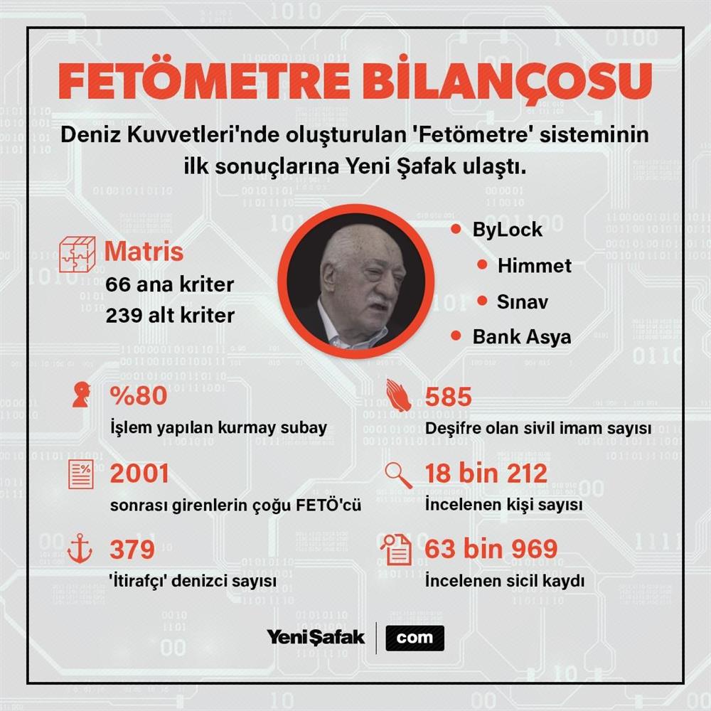 TSK'daki FETÖ'cüleri belirlemek için kurulan Fetömetre önemli sonuçlar verdi. Kurmay subayların yüzde 80'i hakkında idari işlem uygulandı. İtirafçı olan 379 denizci 585 sivil imamı deşifre etti.