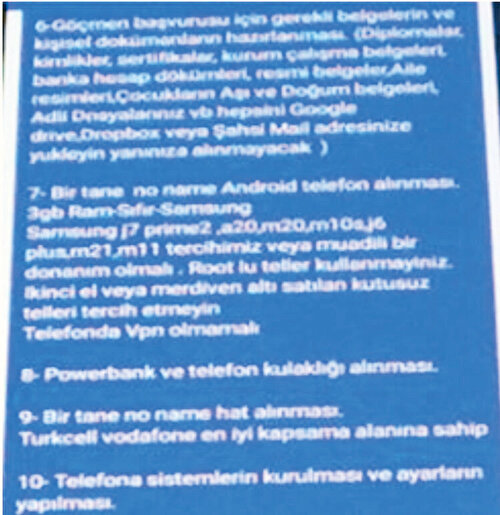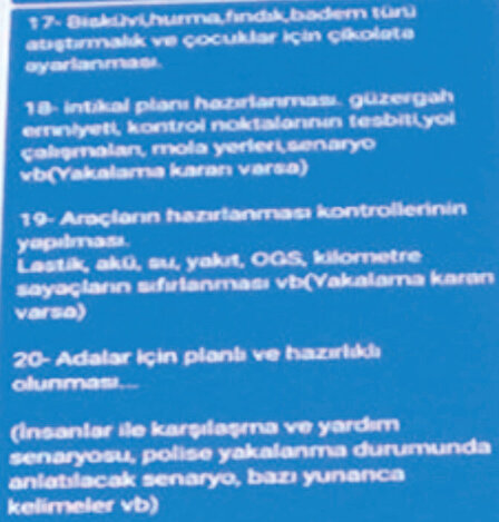 Noname android telefon ile hat alınması da verilen talimatlar arasında. Buna ilişkin “İkinci el veya merdiven altı satılan kutusuz telefonları tercih etmeyin. Telefonda VPN olmamalı” talimatı veriliyor. İntikal planının hazırlanması, güzergah emniyeti ve kontrol noktalarının tespitinin bulunduğu yapılacak hazırlıklar listesinde, “Adalar için planlı ve hazırlıklı olunması” başlığı dikkat çekiyor. Buna ilişkin, “İnsanlar ile karşılaşma ve yardım senaryosu, polise yakalanma durumunda anlatılacak senaryo, bazı Yunanca kelimeler vb.” değerlendirmesi yapılıyor.
