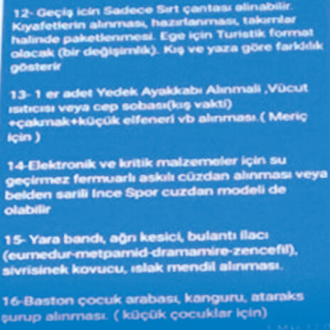Söz konusu listede kaçacak kişilerin yanlarına vücut ısıtıcısı, cep sobası, çakmak, el feneri, yedek ayakkabı, powerbank, telefon kulaklığı, elektronik ve kritik malzemeler için su geçirmez fermuarlı askılı cüzdan, bisküvi, fındık, badem gibi atıştırmalık yiyecekler ile yara bandı, ağrı kesici, bulantı ve kusmayı engelleyen ilaçlar almaları isteniyor.