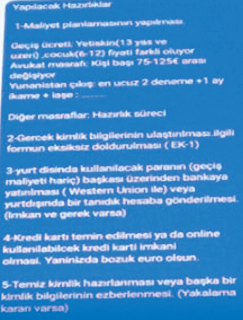 Ele geçen telefon ve dijital materyallerin incelenmesi üzerine şüphelilerin daha önce yasadışı yollardan yurtdışına kaçan kişilerle irtibatlı oldukları belirlendi. Kaçış için yapılacakların yer aldığı bir de talimat listesi bulundu. Yapılacak hazırlıkların başında “maliyet planlaması yapılması” yer alıyor. Maliyet planlanmasında ise geçiş ücreti başlığı bulunuyor. Yetişkin (13 yaş ve üzeri) ile çocuk (6-12 yaş) fiyatının farklı olduğu, avukat masrafının 75-125 Euro arasında değiştiği ifade ediliyor. Yine planlamadaki “Yunanistan çıkış” ve “Diğer masraflar (hazırlık süreci)” başlıkları dikkat çekiyor.