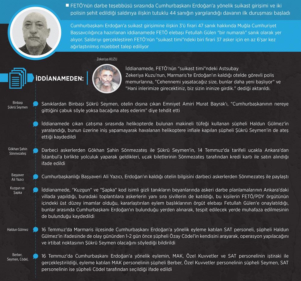 FETÖ'nün darbe teşebbüsü sırasında Cumhurbaşkanı Recep Tayyip Erdoğan'a yönelik suikast girişimi ve iki polisin şehit edildiği saldırıya ilişkin davada, 44 tutuklu sanık ilk kez hakim karşısına çıkarıldı. Duruşmada ilk olarak Cumhurbaşkanı Erdoğan'ın konakladığı Marmaris'teki otele yönelik saldırıyı yönettiği belirtilen eski tuğgeneral Gökhan Şahin Sönmezateş'in ifadesi alınacak.