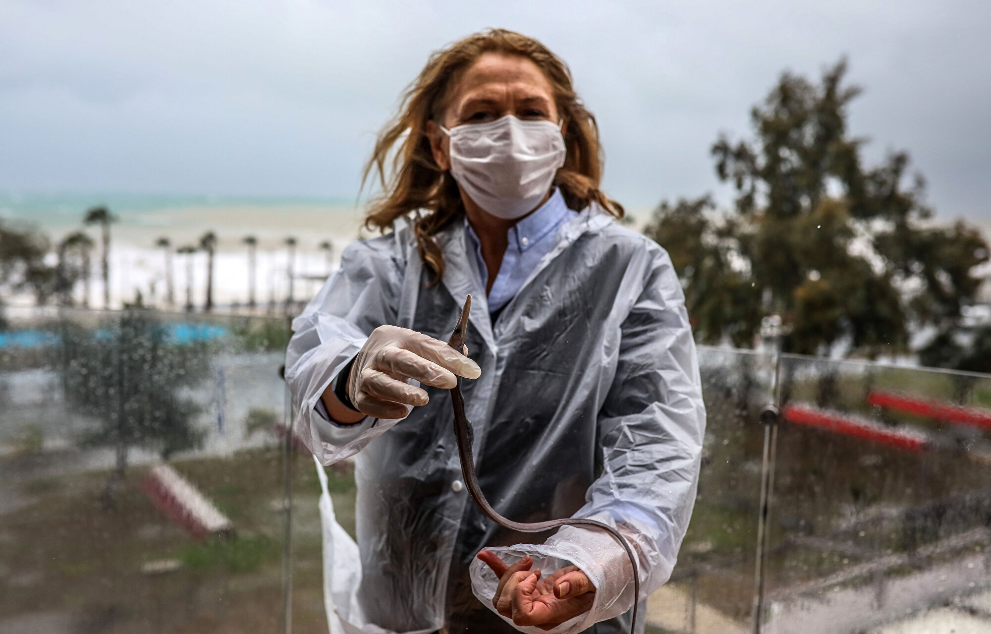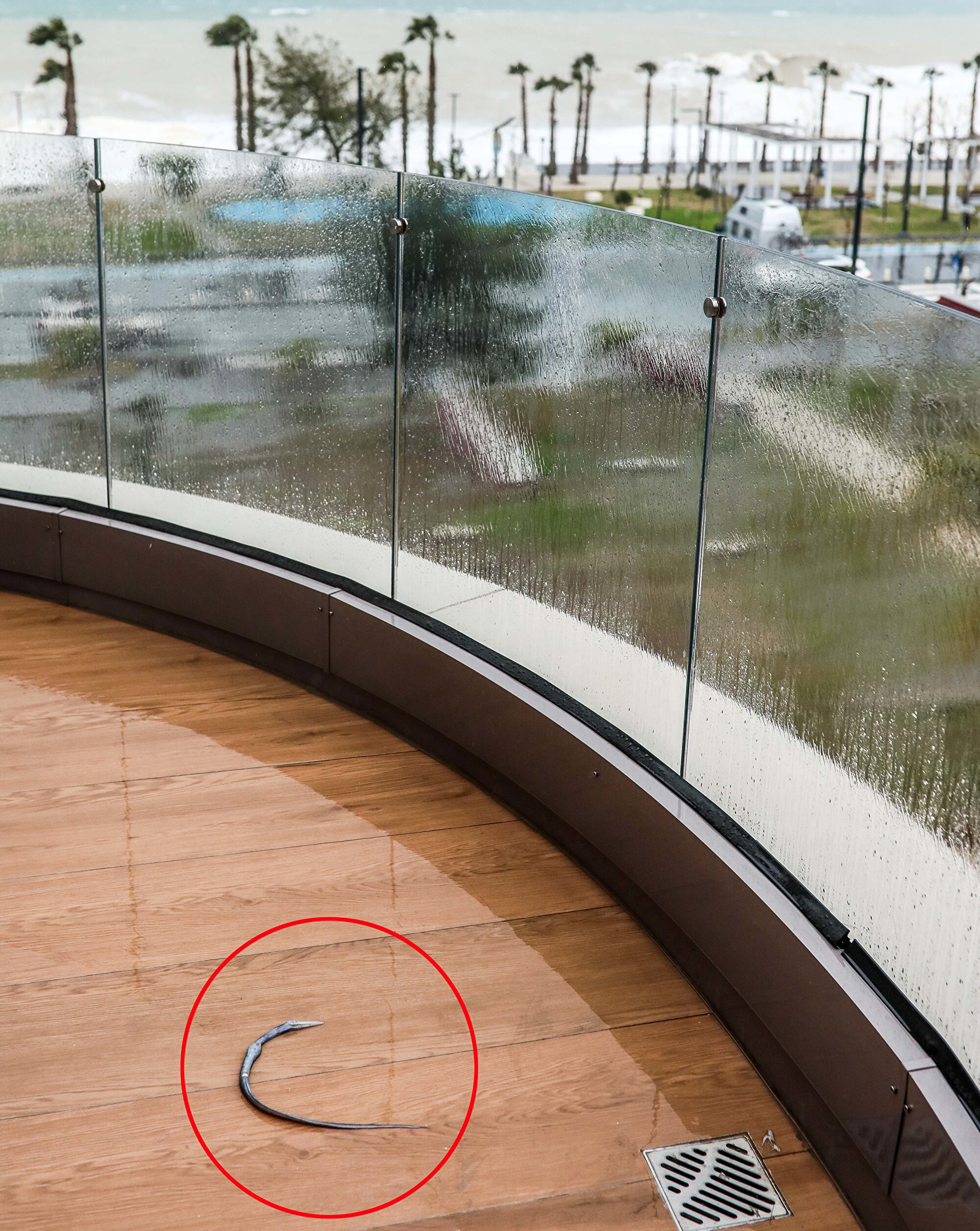Antalya Konyaaltı sahiline fırtınalı havada, 60 metre mesafedeki bir sitenin 3'üncü katında oturan Kadriye Bahadır, balkonunda gördüğü balıkla şaşkına döndü. Akdeniz Üniversitesi Su Ürünleri Fakültesi Öğretim Üyesi Prof. Dr. Gökoğlu, balığın bir tür yılan balığı olduğunu belirterek, "Bu balığı martının biri yemek üzere ya balkona getirdi, ya da taşırken ayağından düşürdü" dedi.