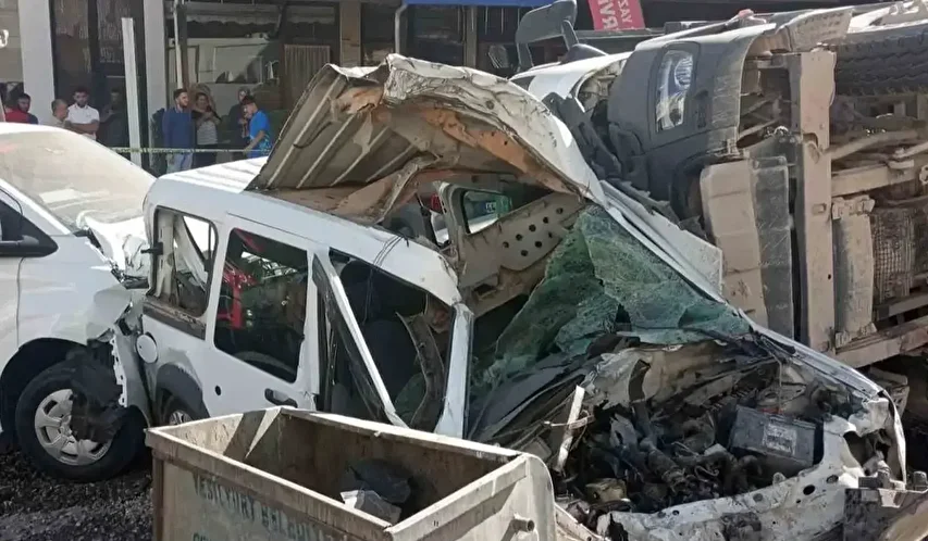 Malatya’da freni patlayan mıcır yüklü hafriyat kamyonu 10’dan fazla araca çarpıp devrildi.