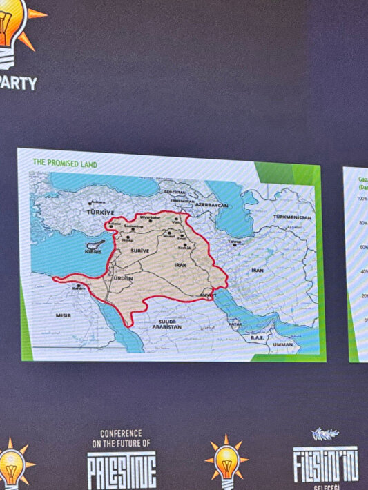 Oktay, sunumda gösterdiği üçüncü haritada, Türkiye'nin topraklarının da içinde olduğu İsrail’in hedefindeki Arz-ı Mevud sınırları gösterildi. Oktay'ın yansıttığı İsrail'in vadedilmiş topraklar haritası, Türkiye'nin Van, Diyarbakır, Gaziantep ve Adana şehirlerini de kapsıyor.