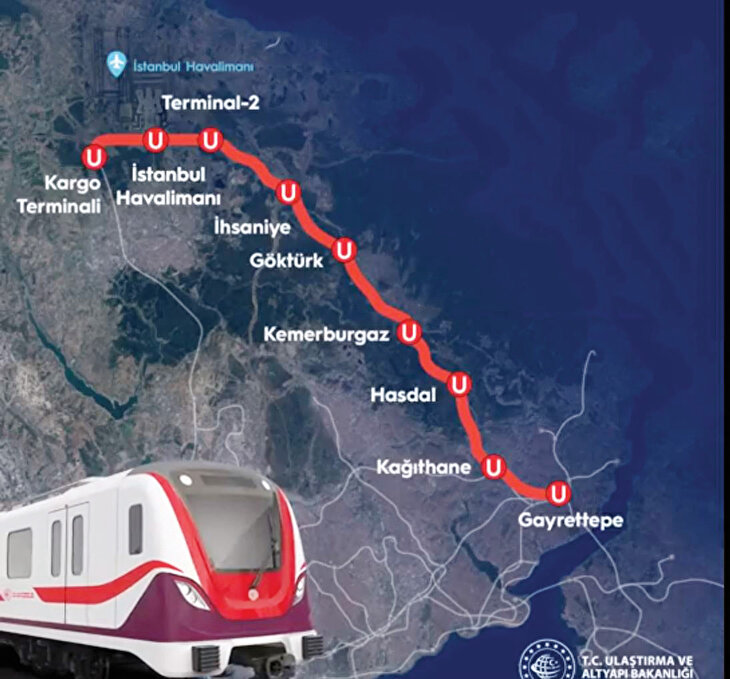 - 9 istasyon bulunuyor. (Gayrettepe, Kağıthane, Hasdal, Kemerburgaz, Göktürk, İhsaniye, Terminal-1, İstanbul Havalimanı, Kargo Terminali)