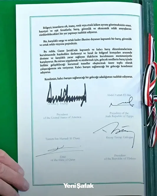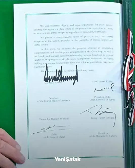 Mısır'ın Şarm el-Şeyh şehrinde Gazze için düzenlenen Barış Zirvesi'nde ateşkes anlaşmasına garantör olan Türkiye, Katar, ABD ve Mısır 'niyet beyanı' imzaladı.