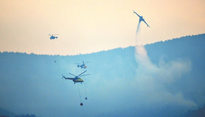 - Kontrol altına alınan yangın bölgesinde soğutma çalışmaları havadan ve karadan devam ediyor. Helikopterler, Uzunhızırlı Göleti’nden aldıkları suları Ilgardere sırtlarına boşaltıyor.