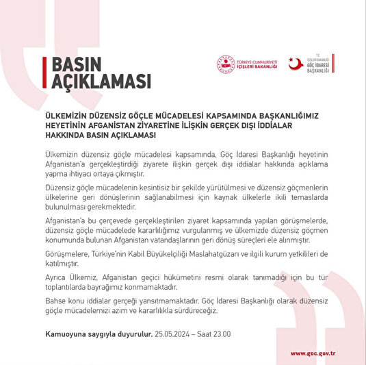 "Türkiye'nin düzensiz göçle mücadelesi kapsamında, Göç İdaresi Başkanlığı heyetinin Afganistan'a gerçekleştirdiği ziyarete ilişkin gerçek dışı iddialar hakkında açıklama yapma ihtiyacı ortaya çıkmıştır. Düzensiz göçle mücadelenin kesintisiz bir şekilde yürütülmesi ve düzensiz göçmenlerin ülkelerine geri dönüşlerinin sağlanabilmesi için kaynak ülkelerle ikili temaslarda bulunulması gerekmektedir. Afganistan'a bu çerçevede gerçekleştirilen ziyaret kapsamında yapılan görüşmelerde, düzensiz göçle mücadelede kararlılığımız vurgulanmış ve ülkemizde düzensiz göçmen konumunda bulunan Afganistan vatandaşlarının geri dönüş süreçleri ele alınmıştır"