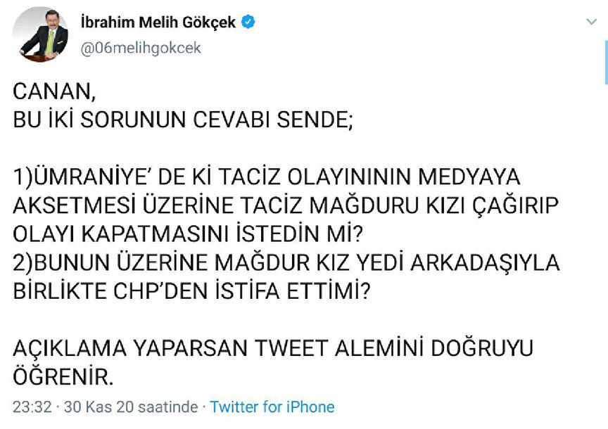 Gökçek, sosyal medyadan yaptığı paylaşımda "Canan, Bu iki sorunun cevabı sende; Ümraniye'de ki taciz olayının medyaya aksetmesi üzerinde taciz mağduru kızı çağırıp olayı kapatmasını istedin mi? Bunun üzerine mağdur kız yedi arkadaşıyla birlikte CHP'den istifa etti mi? Açıklama yaparsan Tweet alemi doğruyu öğrenir" ifadelerini kullandı.
