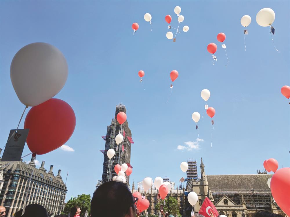 İngiltere’nin başkenti Londra’da darbe girişimi sırasında hayatını kaybeden şehitler için 250 balon havaya bırakıldı. Balonların ucuna şehitlerin fotoğrafları asıldı.