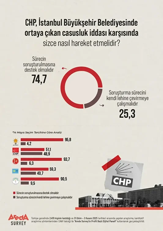 Areda Survey’in 2 bin 455 kişiyle gerçekleştirdiği araştırmaya göre toplumun yüzde 74,7’si, İBB'de ortaya çıkan casusluk iddiasında CHP’nin soruşturma sürecine destek vermesi gerektiğini düşünüyor. 14 Mayıs seçim tercihlerine göre yapılan analizde de tüm seçmen gruplarında bu yaklaşımın belirgin olduğu görülüyor.