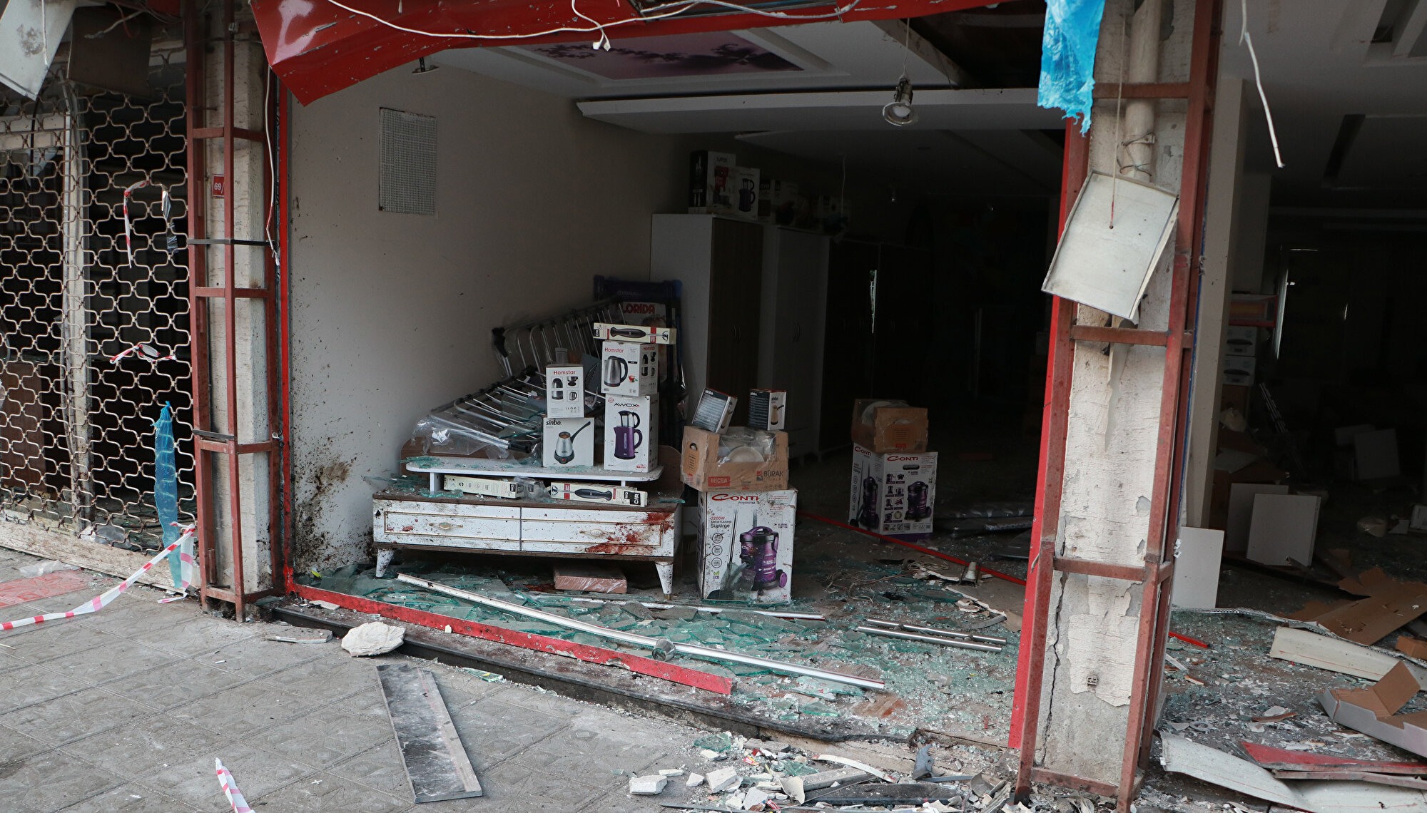 Hatay'ın İskenderun ilçesinde güvenlik güçlerinin iki teröristi takibi sırasında teröristlerden birinin üzerindeki bombayı infilak ettirmesi sonucu meydana gelen patlama nedeniyle camları kırılan ve zarar gören iş yeri ve evlerdeki vatandaşlar, teröre tepki olarak balkon ve pencerelerini Türk bayraklarıyla donattı.