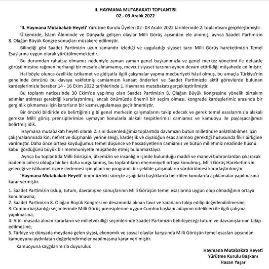 Saadet Partili 46 kişinin bir araya gelerek oluşturduğu Haymana Mutabakatı Heyeti yeni bir bildiri yayınladı. Daha önce Saadet Partisi'nin kongre sürecinde bildiri yayınlayan ve yönetimi açıkca eleştiren heyet bu sefer cumhurbaşkanlığı seçimlerine yönelik açıklama yaptı. Haymana heyeti yazılı yaptığı açıklamada, "Milli Görüş prensiplerine uygun Cumhurbaşkanı adayı çalışması yapacağız" ifadelerini kullandı.