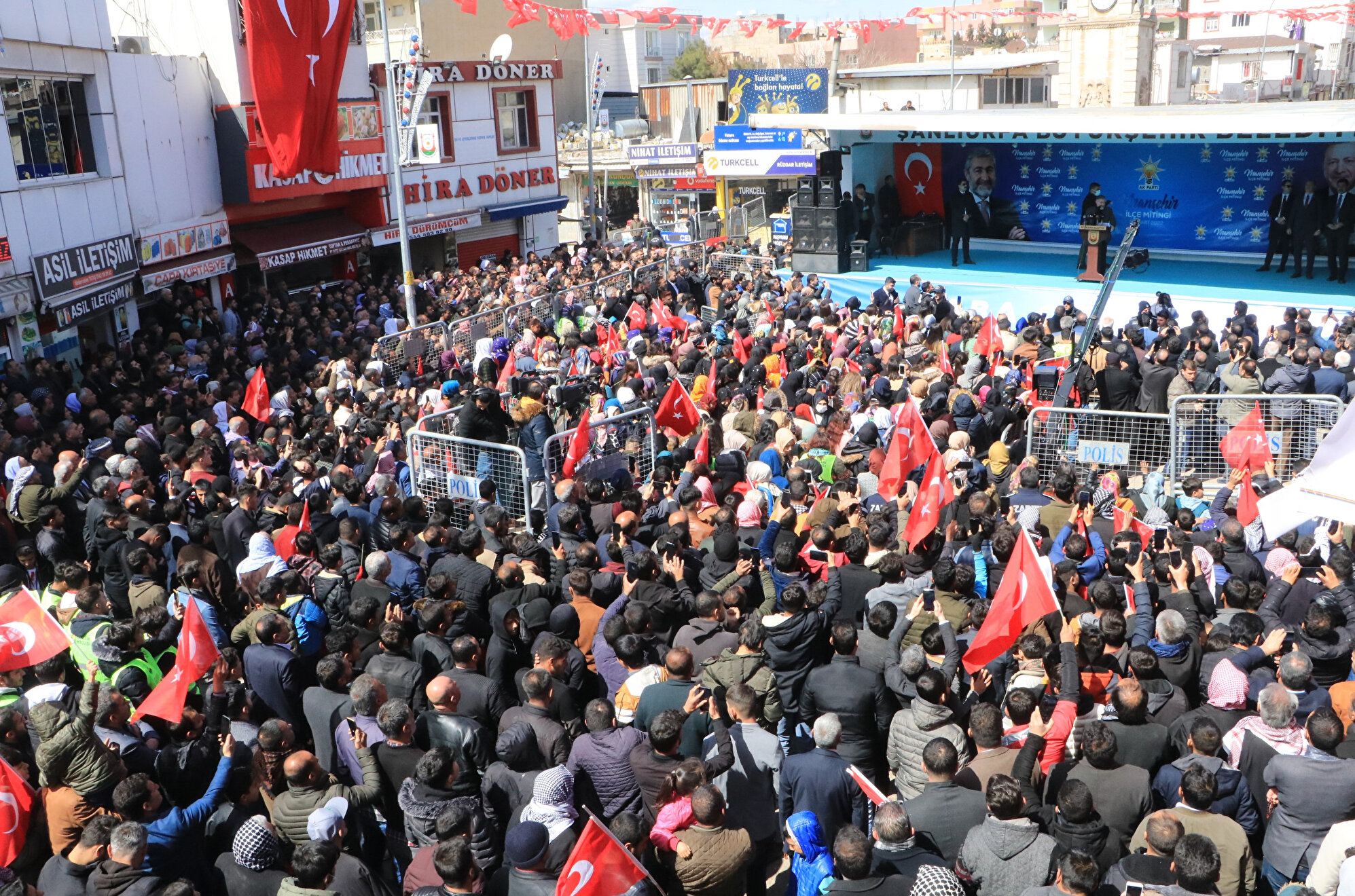 "Şimdi elhamdülillah yolda yürüyenler anlı açık, başı dik bir şekilde 'bana hizmet eden hastaneye, bana hizmet eden doktora gidiyorum, ilaçlarımı da istediğim eczaneden alıyorum' diyor. Minnet yok, Ahmet'e, Mehmet'e, Veli'ye minnet yok. Hiç kimseye minneti yok. Bu devlet herkesin ihtiyacını karşılayacak güce sahiptir. Onun için sadece sağlıkta, yollarda, hastanelerde değil, havaalanlarıyla, savunma sanayileriyle özgür güçlü dış politikasıyla dünyada Türkiye var, Türkiye var dedirtecek bir gücümüz de var elhamdülillah. Türkiye güçlü, Cumhurbaşkanımız Recep Tayyip Erdoğan ile daha da güçlü. Karadeniz'de, Akdeniz'de bir gerginlik mi var Türkiye, dünyada bir gerginlik mi var Türkiye, bir sorun mu var işte Türkü, Kürt'ü, Arap'ı ile bir arada beraber hareket eden, Kabe'deki insanların duasını alan bir Türkiye var, bir lider var elhamdülillah. En temel belediye hizmetlerinden bihaber olanlara belediyeciliği öğrettik. En temel hizmetlerden hakkı olanlara haklarını en iyi şekilde verdik. Projeleri tezgahlarda, raflarda dursun diye yazmadık çizmedik, uygulansın diye gece gündüz demeden çalışarak yerine getirdik. Şanlıurfa'ya, Viranşehir'e yüzlerce projeyle geldik, gelmeye de devam edeceğiz."