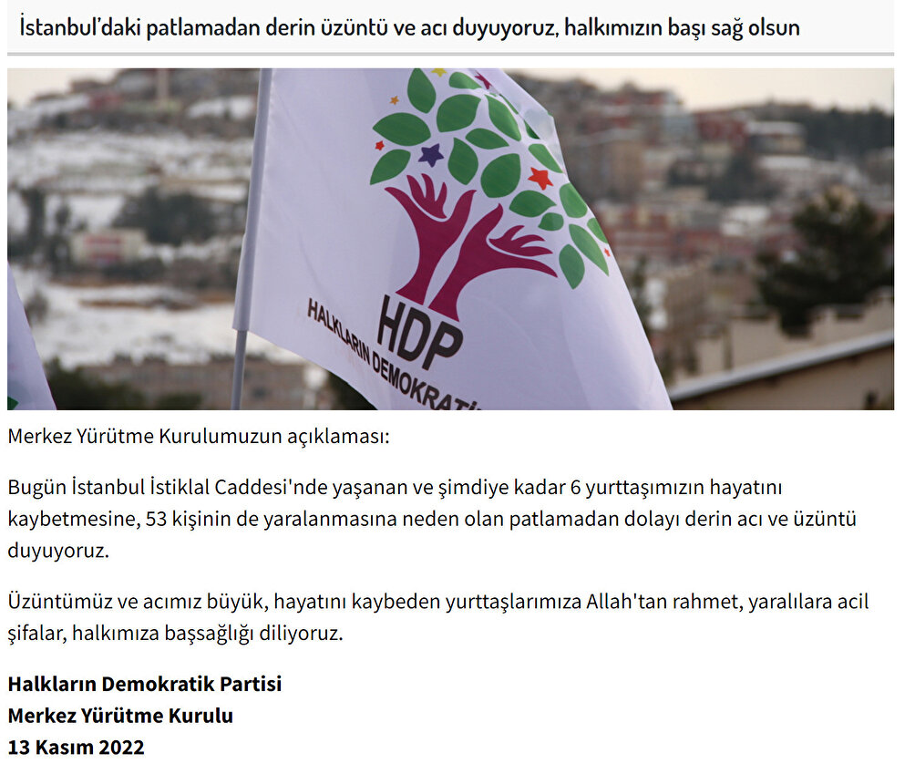 İstiklal Caddesi'nde meydana gelen patlamaya ilişkin HDP'den açıklama geldi. Yaptıkları açıklamada saldırıyı kınamayan HDP, sadece "Üzüntü duyuyoruz" diyerek olayı geçiştirdi.