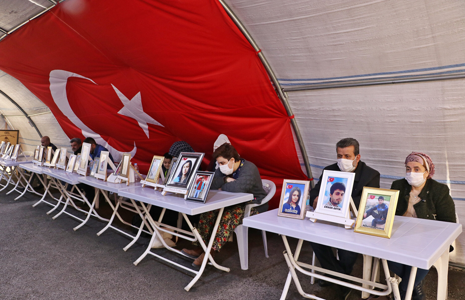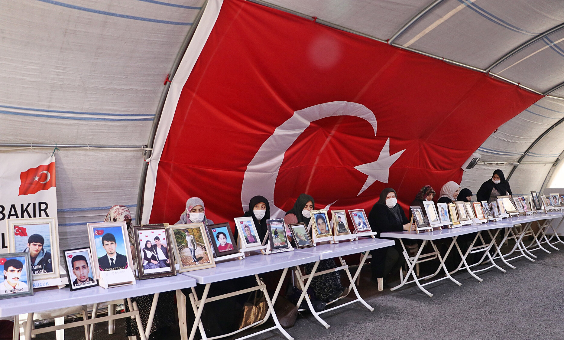 Diyarbakır'da, çocukları terör örgütü PKK tarafından kaçırılan ailelerin HDP binası önündeki evlat nöbeti, 895'inci günde devam ediyor. Evlat nöbetindeki 261 aile, 13 Şubat 2021'de Gara'da şehit edilen 13 polis, asker ve sivili, olayın yıl dönümünde andı.