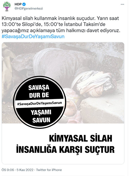 Alçak iftirayı sokaklara taşımaya hazırlanan HDP, sosyal medya hesaplarından "Kimyasal silah kullanmak insanlık suçudur. Yarın saat 13:00'te Silopi'de, 15:00'te İstanbul Taksim'de yapacağımız açıklamaya tüm halkımızı davet ediyoruz." paylaşımında bulundu.