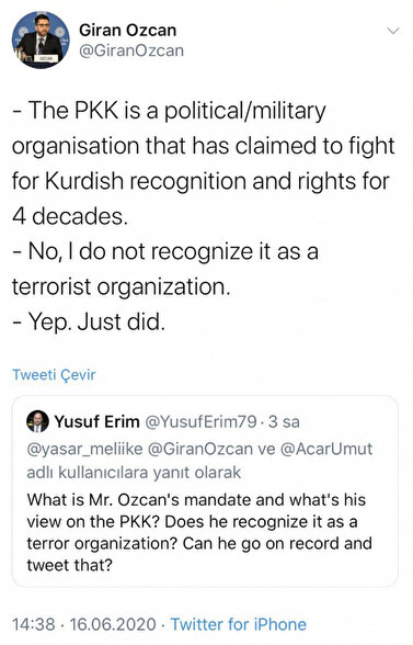 Özcan, TRT World Politika Uzmanı Yusuf Erim'in sosyal medyadan kendisine yönelttiği soruyu cevapladı. PKK'yı siyasi yapılanma olarak tanımlayan Özcan şu ifadeleri kullandı: