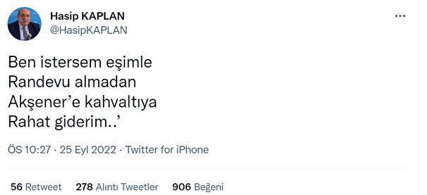 Geçtiğimiz günlerde CHP Genel Başkanı Kemal Kılıçdaroğlu ile ilgili "Yanındayız" mesajı paylaşan HDP'li Hasip Kaplan, şimdi de rotayı İYİ Parti Genel Başkanı Meral Akşener'e çevirdi. Kaplan, sosyal medya hesabından yaptığı paylaşımda "Ben istersem eşimle randevu almadan Akşener’e kahvaltıya rahat giderim." ifadelerini kullandı.