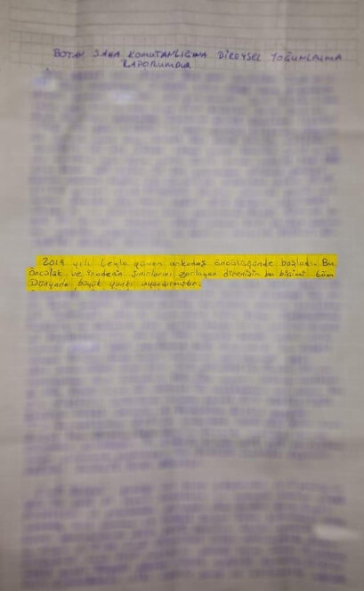 - Aramalarda turuncu kategorideki "Fırat Şah" kod adlı İbrahim İldeniz, "Serhildan Cudi" kod adlı Muhammet Şirin Anakin, "Mervan Kerkük" kod adlı Zana Hazi adlı teröristlerin yazdığı "Botan saha komutanlığına bireysel yoğunlaşma raporumdur" adlı raporlar ele geçirildi.