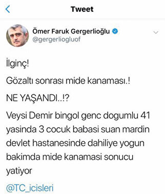 Gergerlioğlu, Mardin’de bir operasyon da gözaltına alınan ve 4 gündür süren mide kanaması geçirdiği belirlendiği için hastaneye kaldırılan FETÖ şüphelisi üzerinden polis saldırıp işkence imasında bulundu. Olay Mardin Kızıltepe’de yaşandı.