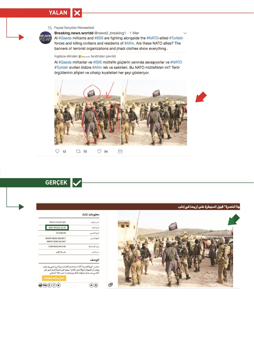 “Afrin’de zeytin ağacını işgalcilerden korumaya çalışan bir ana” yalanıyla servis edilen fotoğrafın, Batı Şeria’da çekildiği ve 1 Temmuz 2015’te “Filistin’in zeytin ağaçlarının yok olmasını durdurun” başlıklı bir haberde kullanıldığı ortaya kondu. İsrail askerlerinin arka planda görüldüğü fotoğrafta, zeytin ağacına sarılan Filistinli bir kadın yer alıyor. Sosyal medyada TSK’yi hedef alan paylaşımlara, devamsızlık gerekçesiyle vekilliği düşürülen Sarıyıldız’ın da destek verdiği görüldü. HDP’nin eski Şırnak Milletvekili Sarıyıldız, Twitter hesabından, “DEAŞ ve El Kaide militanları Afrin’de Türkiye’nin yanında savaşıyor” yalanıyla bir fotoğrafı yeniden paylaştı. Ancak fotoğrafın, 27 Kasım 2015 tarihli, İdlib’e saldırı hazırlığında olan Nusra cephesi ve Ahrar-ü Şam mensuplarına ait olduğu tespit edildi.