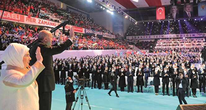 AK Parti Büyük Kongresi’nde 7. kez genel başkanlığa seçilen Cumhurbaşkanı Erdoğan, 19 yılın icraatlarını özetlerken 2023 manifestosunu ve 2053 vizyonunu açıkladı. Erdoğan, “Şimdi artık vakit, daha çok çalışma, üretme, gaza basma, hedeflerimize yürüme vaktidir” dedi. Erdoğan, AK Parti yönetiminin yenilendiği kongrede şu mesajları verdi: İnsanlığı adalet, merhamet, huzurun teminatı olacak küresel yönetim anlayışıyla buluşturacak medeniyet nöbetini devralmaya hazırlanıyoruz. Milletimiz nasıl bir anayasayla yönetilmek istiyorsa, öyle bir anayasa istiyoruz. Yeni Anayasanın ruhunda millet olmalıdır. 2053 vizyonunun hamurunu, diğer her şeyin bunların arkasından geldiği bilinciyle aile, eğitim ve kültürle yoğuracağız. Piyasalarda yaşanan dalgalanmalar, Türkiye ekonomisinin temellerini, gerçek dinamiklerini yansıtmıyor. Birilerinin ‘battık, bittik, yıkıldık, öldük’ diye terane tutturduğuna, bakmayın.