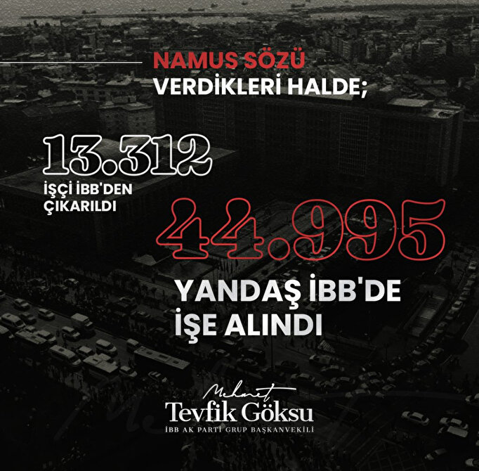 31 Mart 2019 yerel seçimlerinde CHP’ye geçen İstanbul Büyükşehir Belediyesi, Ekrem İmamoğlu başkanı olduktan sonra işçi kıyımına başlamıştı. Ak Parti Grup Başkanvekili Tevfik Göksu'nun son paylaştığı verilere göre; 13 bin 312 işçiyi kovan CHP'li belediye, geçen süreçte yaklaşık 44 bin 995 yandaş kişiyi işe aldı.