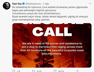 Orman yangınlarıyla mücadele eden Türkiye’nin yangınları söndürmekte “aciz olduğu” algısını yaymak için başlatılan ‘Help Turkey’ (Türkiye'ye yardım edin) manipülasyonuna bir destek de Fazıl Say’dan geldi.