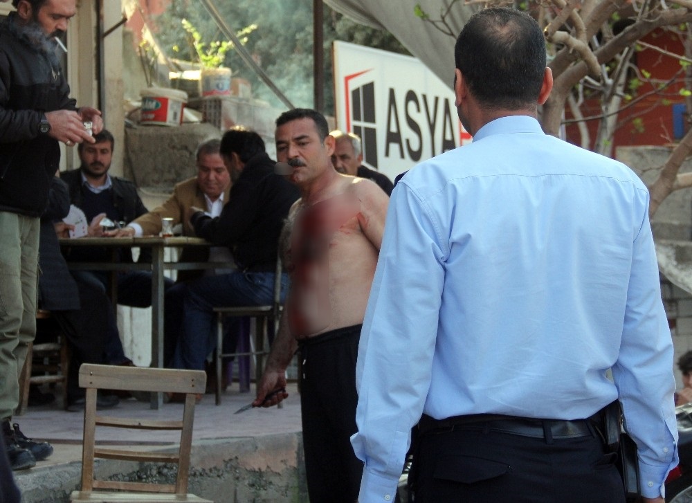 Adana’da meskun mahalde havaya eteş etmek suçundan bir ay 7 gün kesinleşmiş hapis cezası olan şahıs, polis gelince kendine bıçak ve şişe ile zarar verirken aynı zamanda ikram edilen Türk kahvesini içti, çevredeki vatandaşlar da bu anları kahvenin önünde kağıt oynayarak izledi.