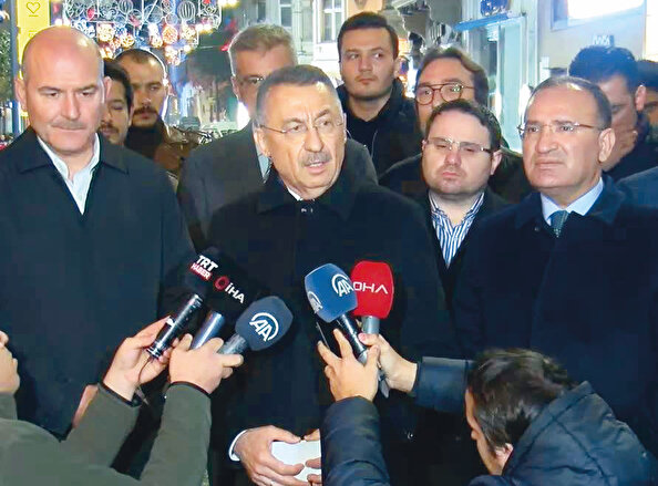 Cumhurbaşkanı Yardımcısı Fuat Oktay, İçişleri Bakanı Süleyman Soylu, Adalet Bakanı Bekir Bozdağ, bombalı saldırının meydana geldiği İstiklal Caddesi’nde incelemelerde bulundu. Basın mensuplarına açıklamalarda bulunan Fuat Oktay, olayın bir terör eylemi olduğunu söyleyerek şöyle devam etti: Gerek sınırlarının içinde gerek ötesinde biz kararlıyız bu olayların arkasında kim varsa, sonuna kadar sınırların dışına kadar değil dünyanın öbür ucuna da gitse, diğer teröristlere nasıl ulaştıysak bunlara da ulaşacaktır ve Türkiye’ye getirilecektir. Gereği yapılacaktır, yargıya teslim edilecektir, her ne pahasına olursa olsun bunun hesabı sorulacaktır.