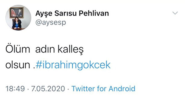 Sabah'ın haberine göre; terör örgütünün talimatıyla ölüm orucuna girip ölen İbrahim Gökçek'e ilginç bir isimden destek geldi. İzmir Karşıyaka Hâkimi Ayşe Sarısu Pehlivan, İbrahim Gökçek'in ardından ağıt yakarcasına paylaşımlarda bulundu.