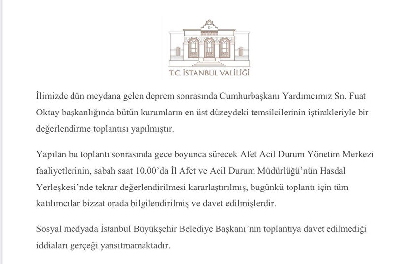 İstanbul Valiliği tarafından, gerçekleşen 5.8 büyüklüğündeki depremle ilgili gelişmelerin değerlendirildiği toplantıya İBB Başkanı Ekrem İmamoğlu bizzat aranarak davet edildi. Ancak İmamoğlu, yoğun programını gerekçe göstererek toplantıya katılmayacağını bildirdi ve yerine genel sekreter yardımcısını gönderdi.